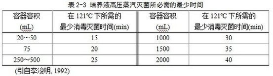 滅菌器內(nèi)冷空氣,以便使蒸汽能到達(dá)各個消毒部位,保證消毒滅菌徹底。然后繼續(xù)加壓加熱,當(dāng)壓力表讀數(shù)達(dá)到1.0~1.1 kg/cm2為121 ºC,保持15~20 min即可。由于消毒滅菌效果取決于溫度而不是壓力,所以在一定壓力下保持較長的消毒滅菌時間是必須的。在121 ºC的蒸汽溫度下可以很快殺死各種細(xì)菌及高度耐熱的芽孢桿菌,因此許多培養(yǎng)液的消毒滅菌壓力、溫度一般保持在1.0~1.1 kg/cm2、121 ºC。消毒滅菌時間與需要消毒滅菌的培養(yǎng)液量密切相關(guān)(表2-3),時間不足達(dá)不到滅菌效果,時間過長培養(yǎng)液內(nèi)的一些化學(xué)物質(zhì)遭到破壞,影響培養(yǎng)液成分。消毒滅菌結(jié)束后,關(guān)閉熱源,只有當(dāng)