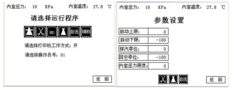 菌過程的溫度、壓力、時間、過程階段、預置參數(shù)等均在觸摸屏顯示器中自動顯示并可以隨時儲存,并配有微型打印機進行打印工作過程參數(shù)以便于歸檔、備查。此外,該控制系統(tǒng)配備有一套完整的自測及校正程序,可以實現(xiàn)不同海拔高度下、不同地區(qū)的壓力、溫度等參數(shù)的校正;還具有多級控制保護、幫助功能。