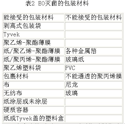 4 EO滅菌包裝材料要求 用于EO滅菌的包裝材料**少需具備以下特點(diǎn):必須允許EO滅菌劑的進(jìn)入;能耐受一定的濕度;能較容易地去除EO殘留。常見的EO包裝材料見表2。